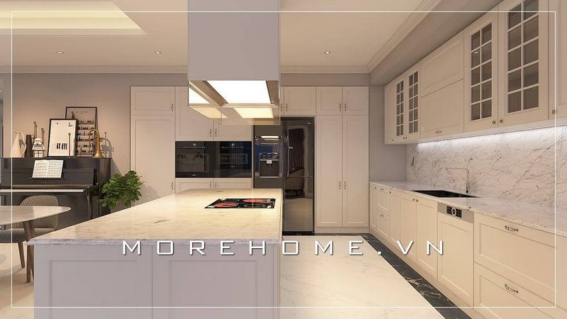 Thiết kế nội thất phòng bếp theo phong cách tân cổ điển, tinh tế và sang trọng đến từng chi tiết.
