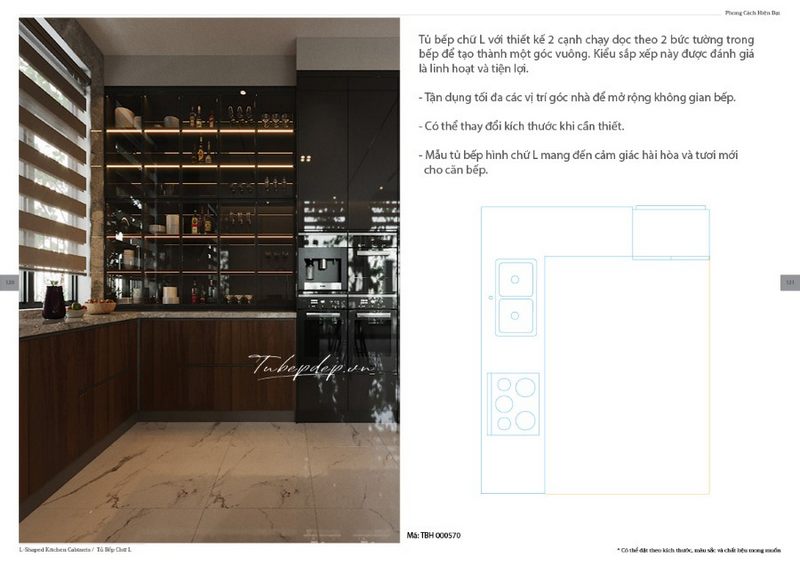 Tủ bếp chữ L với thiết kế 2 cạnh chạy dọc theo bức tường bếp tối ưu diện tích cùng với hệ thống tủ bếp trên mặt kính tiện lợi, trẻ trung