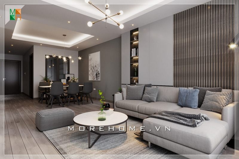 Sofa góc hiện đại bọc vải màu ghi nhẹ nhàng, ấm cúng làm cho phòng khách chung cư trở nên ấn tượng.