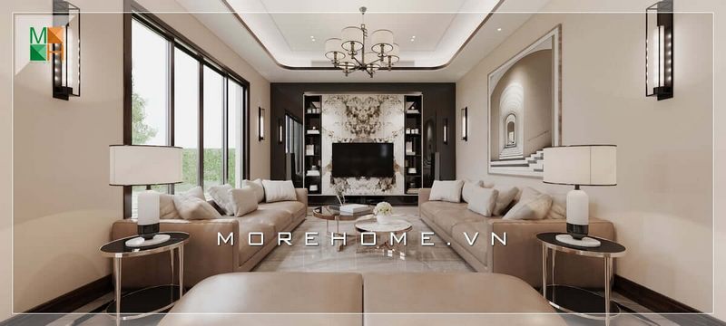 Tạo ra một không gian liền phòng ăn trong biệt thự, nhà phố bằng cách thiết kế nội thất phòng khách theo phong cách tân cổ điển sang trọng, giúp tạo nên sự cao cấp và ấn tượng.